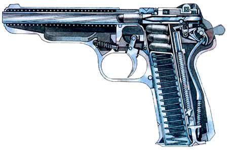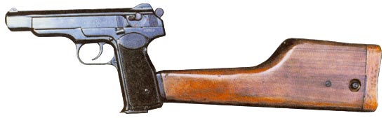 В 1951 г. одновременно с ПМ на вооружение Советской Армии поступил 9-мм автоматический пистолет И.Я. Стечкина. 7,62-мм автоматический пистолет был темой дипломного проекта Стечкина и, после окончания Тульского механического института, ему была поручена разработка автоматического пистолета под 9-мм патрон. Интересно, что в это же время был создан ряд малогабаритных пистолетов-пулеметов, но от развития пистолетов-пулеметов в нашей стране в послевоенные годы отказались и вернулись к ним только позже. Автоматика АПС («автоматического пистолета Стечкина») действует за счет отдачи свободного затвора. Первый вариант автоматического пистолета напоминал по компоновке «Браунинг» с расположением возвратной пружины под стволом. Однако серийный пистолет был построен по той же схеме, что и ПМ: похожий кожух-затвор, обтекаемые формы, возвратная пружина затвора также надета на ствол. В целом же это отличная от ПМ конструкция.