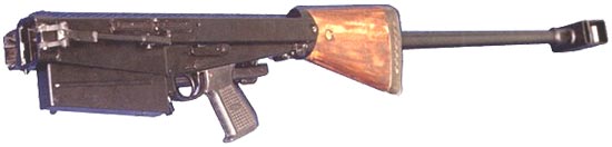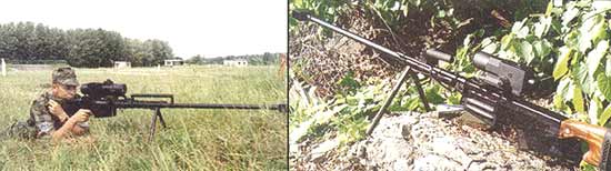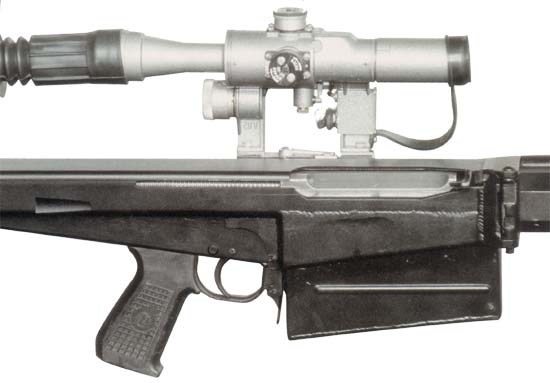 Теперь об отечественной снайперской винтовке калибра 12,7 мм. Это уже достаточно известная по рекламе В-94, пятизарядная полуавтоматическая под штатный пулеметный патрон 12,7х107. Винтовка оригинальна тем, что в транспортном положении складывается до 1100мм при длине ствола 1000 мм. Свое название снайперская дальнобойная винтовка будет оправдывать, если патрон обеспечит кучность из баллствола на дистанции 100 м примерно 3 см (поперечник) или на дистанции 1000 м примерно 40 см. К сожалению, такой патрон еще не создан. Практически можно обеспечить более или менее снайперскую стрельбу штатными патронами, отобрав их по биению вершинки пули относительно ската гильзы на величину не более 0,1 мм. В этом случае винтовка обеспечивает поперечник 5 см из серии 5 выстрелов на дистанции 100 м. Винтовка снабжена специальным оптическим 13-кратным прицелом ПОС 13х60. Его особенностью является высвечиваемая установленная дальность стрельбы и постоянное расположение марки в центре объектива при стрельбе на любую дальность (до 2000 м). Хорошую комфортабельность стрельбы обеспечивает вынос зрачка прицела до 110 мм. Однако масса ПОС 13х60 велика (3,5 кг). Поэтому в настоящее время разработан 12-кратный облегченный прицел ПОС 12х54 без высвечивания установленной дальности, Важным аспектом применения снайперского оружия является стрельба в ночных условиях. Появившиеся в последние годы ночные прицелы на электронно-оптических преобразователях II и II+ поколений с автоматической регулировкой яркости, не подверженные засветке от осветительных ракет, разрывов снарядов (ПКН-ОЗ; ПКН-032; ПКН-04), делают реальной такую стрельбу для всех видов рассматриваемых здесь винтовок.