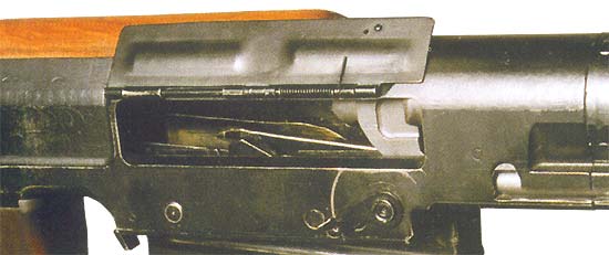В походном положении окно для экстракции стреляной гильзы закрывается крышкой. Между пистолетной рукояткой и укороченным прикладом поместили 5-зарядный однорядный коробчатый магазин. Магазин спереди снабжен накладкой для удобства удержания во время стрельбы .