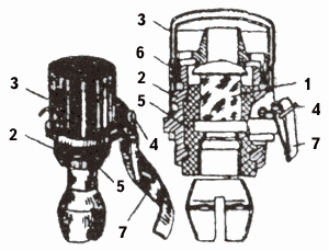 Выстрел ПГ-7ВМ является модернизацией выстрела ПГ-7В, он несколько легче и превосходит его по бронепробиваемости, кучности боя и ветроустойчивости. Взрыватель выстрела ПГ-7В (рис. 11) служит для обеспечения разрыва гранаты при встрече с целью (преградой). Он имеет головную и донную части связанные между собой электрически. Время работы взрывателя равно 0,00001 сек.