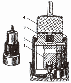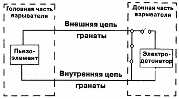 Электрическая связь обеих частей взрывателя осуществляется через внешнюю и внутреннюю цепи (рис. 13), которые образовываются металлическими частями гранаты. Внешняя цепь: обтекатель - корпус; внутренняя цепь: токопроводящий конус - воронка - проводник.