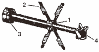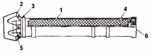 В трубе помещается нитроглицериновый ленточный пороховой заряд, воспламенитель, пирозамедлитель, который приводит в действие реактивный двигатель после того, как граната будет от стрелка на расстоянии 15-20 метров. Сопла соплового блока расположены под углом к корпусу, для создания вращательного движения гранаты в полёте. Фиксатор с шайбой служит для того, чтобы капсюль-воспламенитель при заряжании выстрела в гранатомёт располагался напротив бойка, а также, чтобы выстрел не выпадал при наклоне ствола вниз. Стабилизатор (рис. 15) обеспечивает устойчивый полёт гранаты в воздухе.