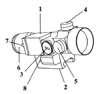 Прицел конструктивно состоит (Ил. 2) из корпуса 1 с узлом крепления к оружию 2 (переходной крепежной планки) типа «Weaver». Крепление такого типа, наиболее распространенное за рубежом, гарантирует надежную фиксацию прицела и обеспечивает его установку на различные виды оружия с помощью переходников. В корпусе расположены оптические элементы формирования изображения прицельной марки, электронная система автоматической регулировки яркости марки, батарейный отсек 3.